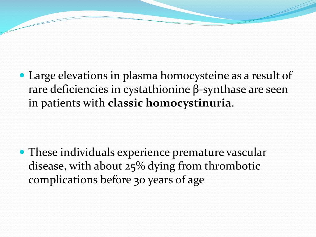 Large elevations in plasma homocysteine as a result of rare deficiencies in cystathionine β-synthase are seen in patients with classic homocystinuria. • These individuals experience premature vascular disease, with about 25% dying from thrombotic complications before 30 years of age