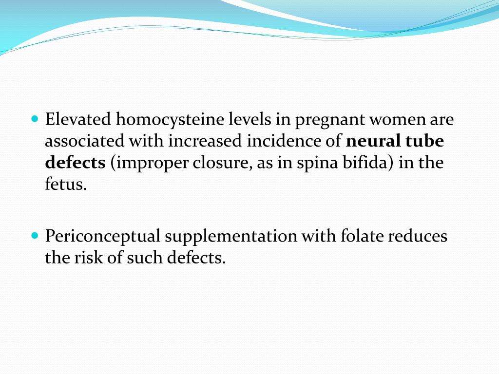 Elevated homocysteine levels in pregnant women are associated with increased incidence of neural tube defects (improper closure, as in spina bifida) in the fetus. • Periconceptual supplementation with folate reduces the risk of such defects.