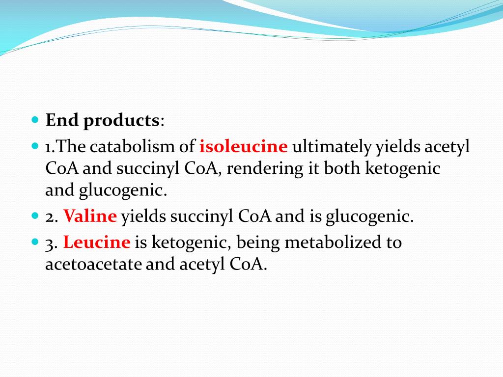 End products: • 1.The catabolism of isoleucine ultimately yields acetyl CoA and succinylCoA, rendering it both ketogenic and glucogenic. • 2. Valineyields succinylCoA and is glucogenic. • 3. Leucineis ketogenic, being metabolized to acetoacetate and acetyl CoA.
