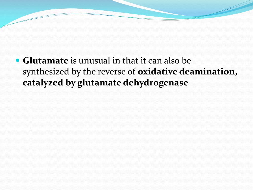 Glutamate is unusual in that it can also be synthesized by the reverse of oxidative deamination, catalyzed by glutamate dehydrogenase