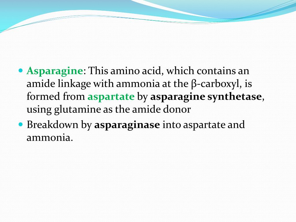 Asparagine: This amino acid, which contains an amide linkage with ammonia at the β-carboxyl, is formed from aspartateby asparaginesynthetase, using glutamine as the amide donor • Breakdown by asparaginase into aspartate and ammonia.