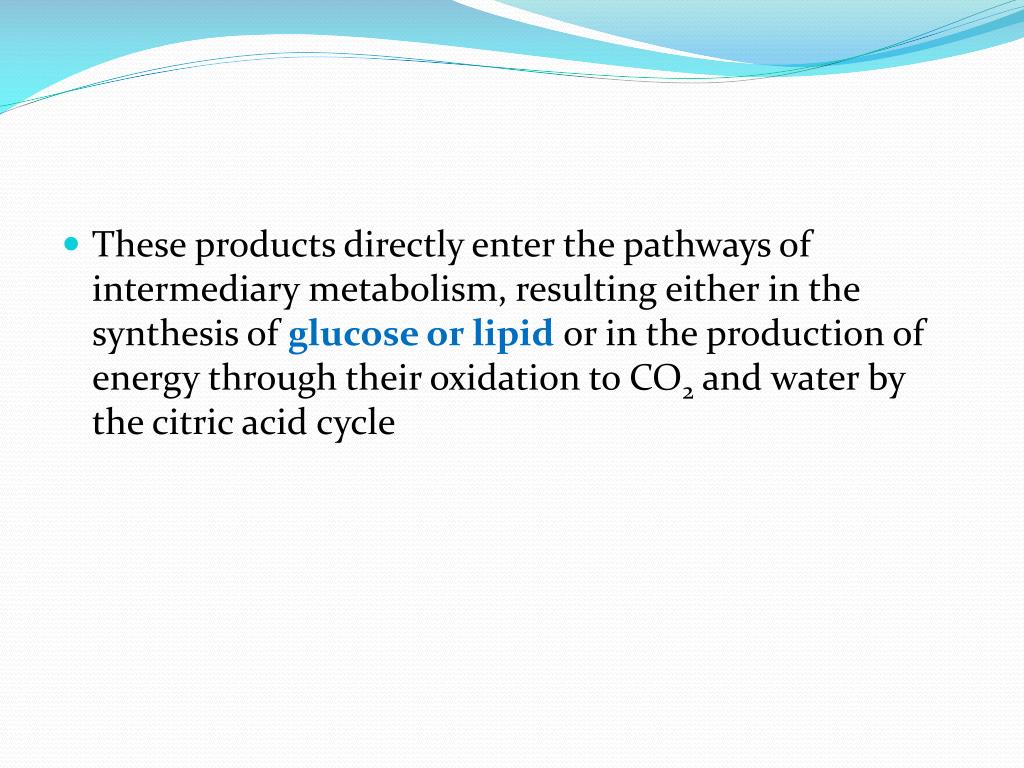These products directly enter the pathways of intermediary metabolism, resulting either in the synthesis of glucose or lipid or in the production of energy through their oxidation to CO2 and water by the citric acid cycle
