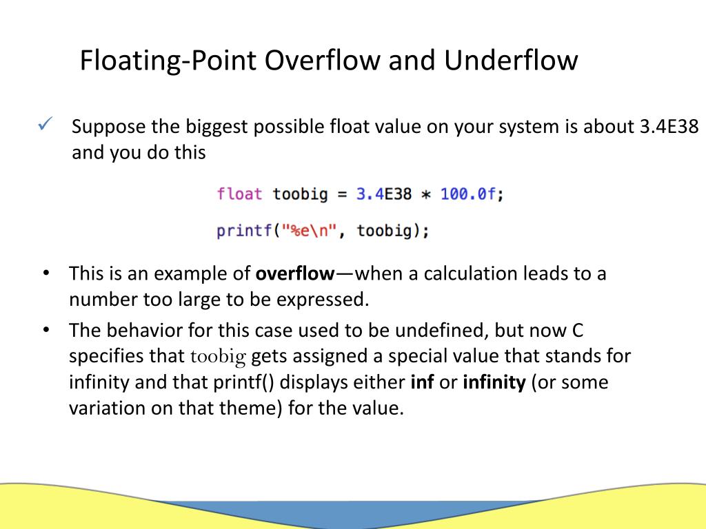 Floating-Point Overflow and Underflow • This is an example of overflow—when a calculation leads to a number too large to be expressed. • The behavior for this case used to be undefined, but now C specifies that toobig gets assigned a special value that stands for infinity and that printf() displays either inf or infinity (or some variation on that theme) for the value. Suppose the biggest possible float value on your system is about 3.4E38 and you do this