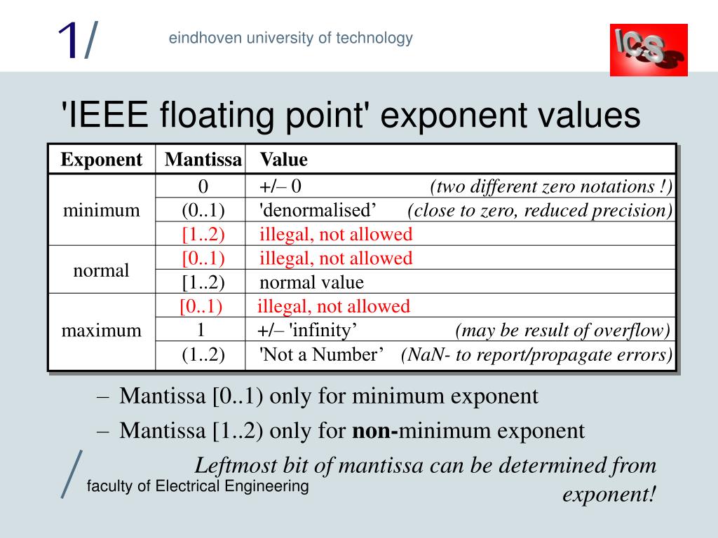 The IEEE 754-185 floating point standard • Lots of choices, a standard was needed ! Baseis taken 2 here Mantissa is given as sign-and-magnitude value • Separate sign bit • Magnitude as fixed point binary with range [0..2) Exponentis given as ordinal with fixed negative offset • Minimum and maximum exponent values are special cases for encoding zero, overflow etc.