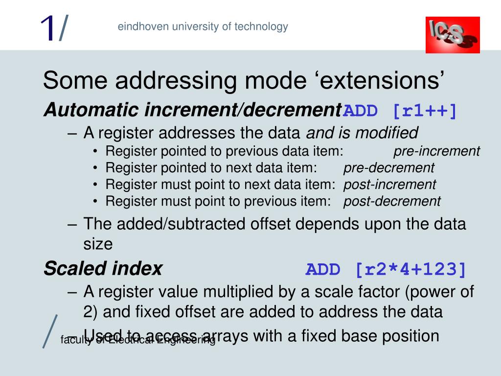 Basic adressing modes ImmediateADD #15The instruction includes the (constant!) data itself RegisterADD r1A register contains the actual data Absolute (or ‘Direct’)ADD [105]A directly specified (constant) address contains the data IndirectADD [r2]A register contains the address of the data Indexed (or ’Based')ADD [r4 + 14]A register and a fixed offset are added to address the data