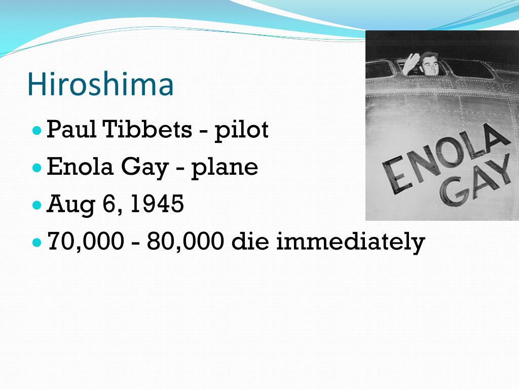 Hiroshima • Paul Tibbets - pilot • Enola Gay - plane • Aug 6, 1945 • 70,000 - 80,000 die immediately