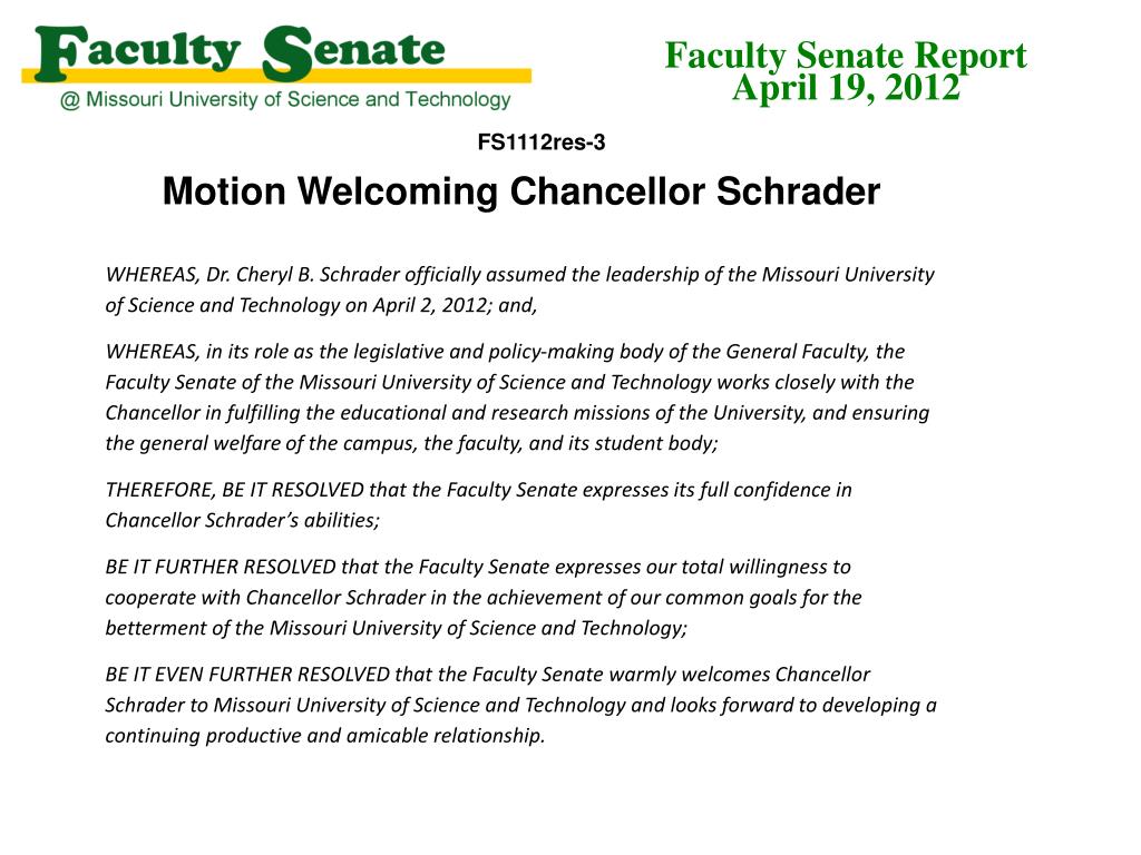 Faculty Senate Report April 19, 2012 FS1112res-3 • Motion Welcoming Chancellor Schrader • WHEREAS, Dr. Cheryl B. Schrader officially assumed the leadership of the Missouri University of Science and Technology on April 2, 2012; and, • WHEREAS, in its role as the legislative and policy-making body of the General Faculty, the Faculty Senate of the Missouri University of Science and Technology works closely with the Chancellor in fulfilling the educational and research missions of the University, and ensuring the general welfare of the campus, the faculty, and its student body; • THEREFORE, BE IT RESOLVED that the Faculty Senate expresses its full confidence in Chancellor Schrader’s abilities; • BE IT FURTHER RESOLVED that the Faculty Senate expresses our total willingness to cooperate with Chancellor Schrader in the achievement of our common goals for the betterment of the Missouri University of Science and Technology; • BE IT EVEN FURTHER RESOLVED that the Faculty Senate warmly welcomes Chancellor Schrader to Missouri University of Science and Technology and looks forward to developing a continuing productive and amicable relationship.