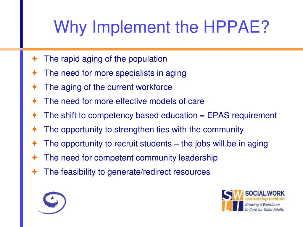 Why Implement the HPPAE? • The rapid aging of the population • The need for more specialists in aging • The aging of the current workforce • The need for more effective models of care • The shift to competency based education = EPAS requirement • The opportunity to strengthen ties with the community • The opportunity to recruit students – the jobs will be in aging • The need for competent community leadership • The feasibility to generate/redirect resources