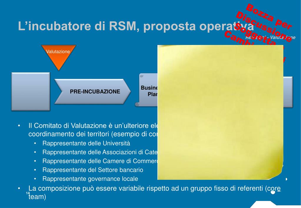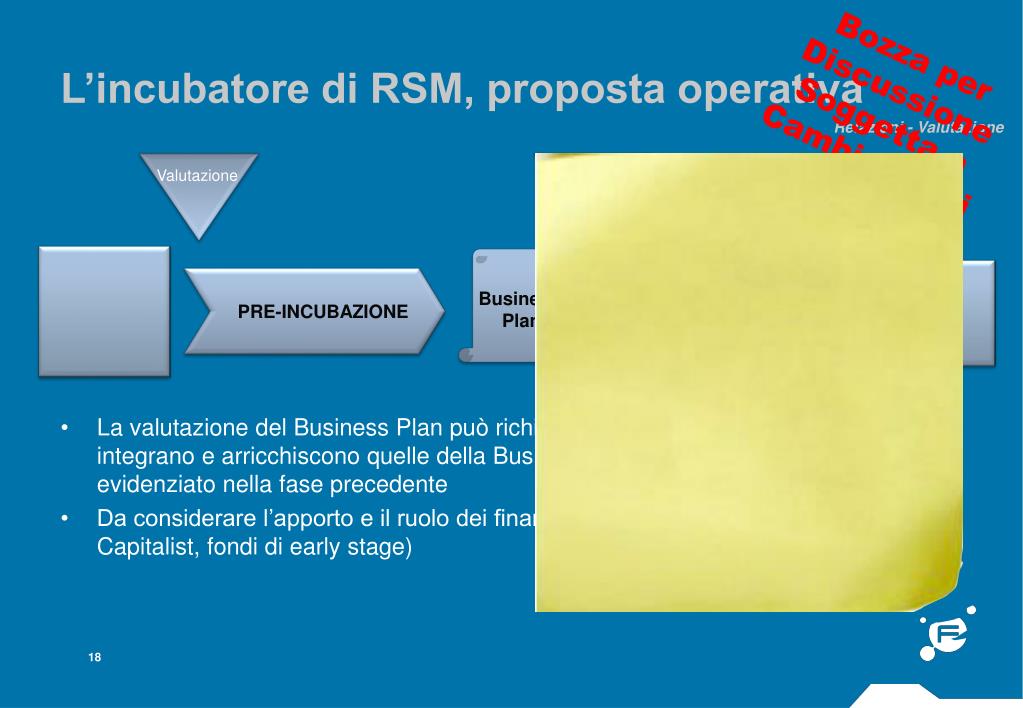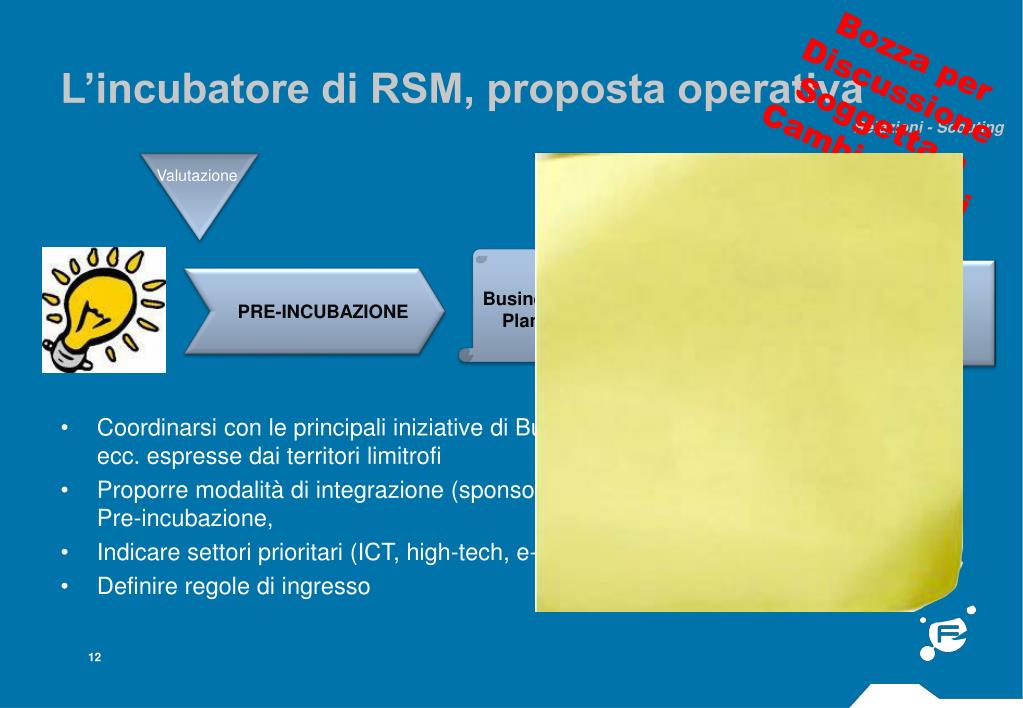 L’incubatore di RSM, proposta operativa Bozza per Discussione Soggetta a Cambiamenti Relazioni - Scouting Valutazione Valutazione • Coordinarsi con le principali iniziative di Business Plan Competition, Start-Cup, ecc. espresse dai territori limitrofi • Proporre modalità di integrazione (sponsorship) e di erogazione di servizi per la Pre-incubazione, • Indicare settori prioritari (ICT, high-tech, e-tourism) • Definire regole di ingresso Business Plan PRE-INCUBAZIONE INCUBAZIONE