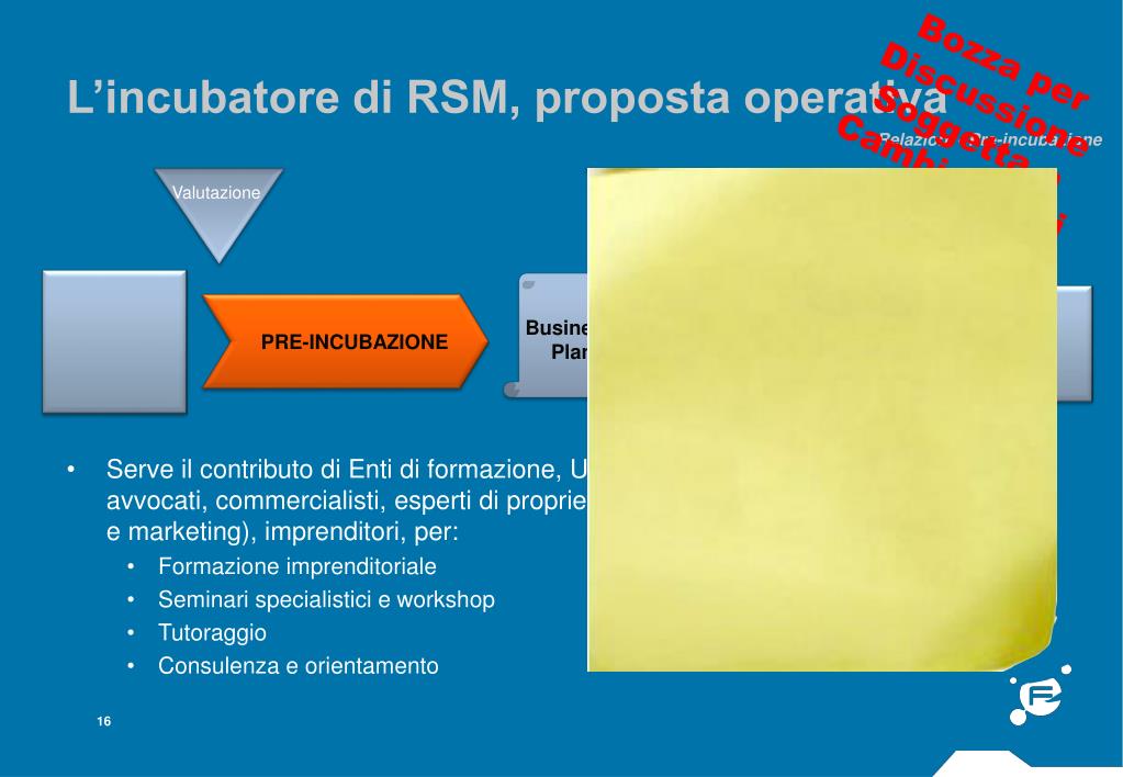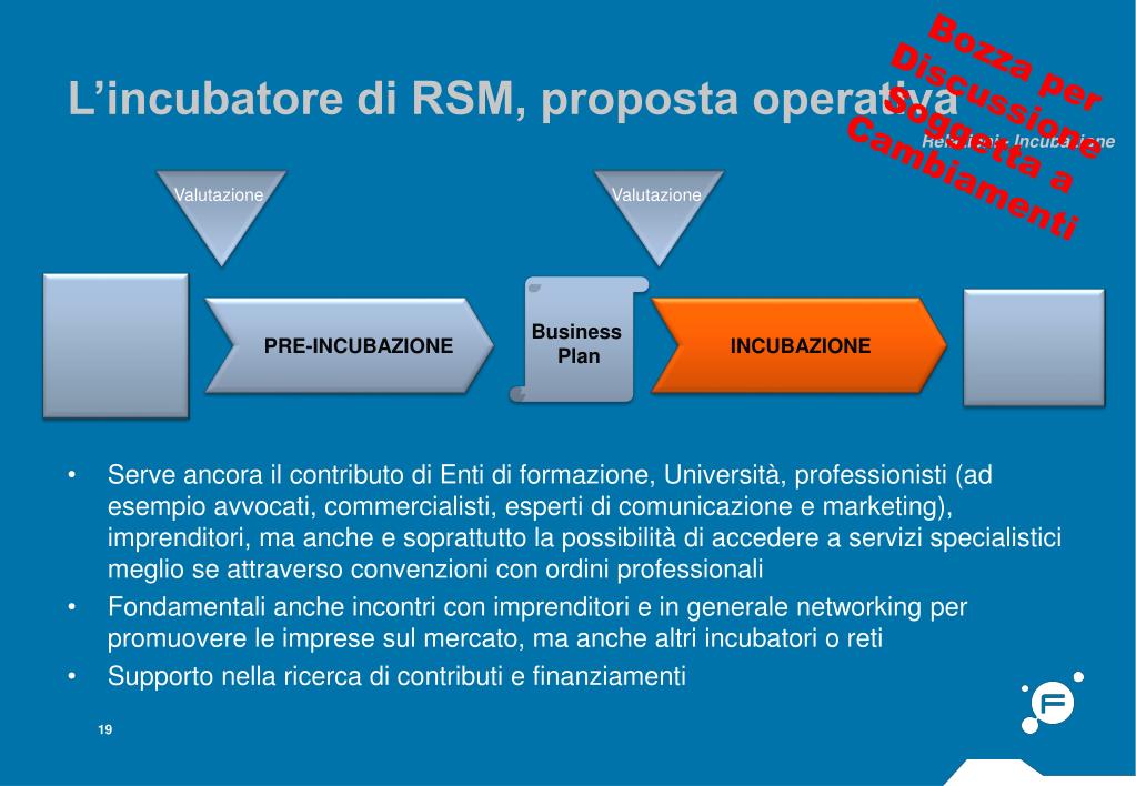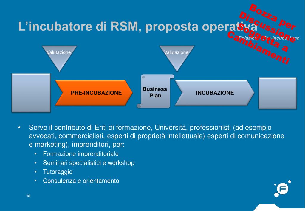 L’incubatore di RSM, proposta operativa Bozza per Discussione Soggetta a Cambiamenti Relazioni - Pre-incubazione Valutazione Valutazione • Serve il contributo di Enti di formazione, Università, professionisti (ad esempio avvocati, commercialisti, esperti di proprietà intellettuale) esperti di comunicazione e marketing), imprenditori, per: • Formazione imprenditoriale • Seminari specialistici e workshop • Tutoraggio • Consulenza e orientamento Business Plan PRE-INCUBAZIONE INCUBAZIONE