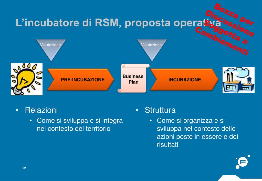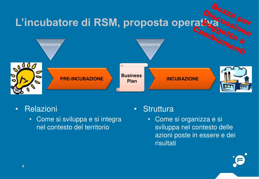 L’incubatore di RSM, proposta operativa Bozza per Discussione Soggetta a Cambiamenti Valutazione Valutazione Struttura Come si organizza e si sviluppa nel contesto delle azioni poste in essere e dei risultati • Relazioni • Come si sviluppa e si integra nel contesto del territorio Business Plan PRE-INCUBAZIONE INCUBAZIONE