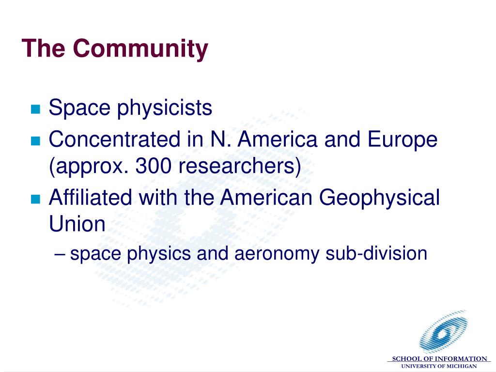 The Community • Space physicists • Concentrated in N. America and Europe (approx. 300 researchers) • Affiliated with the American Geophysical Union • space physics and aeronomy sub-division