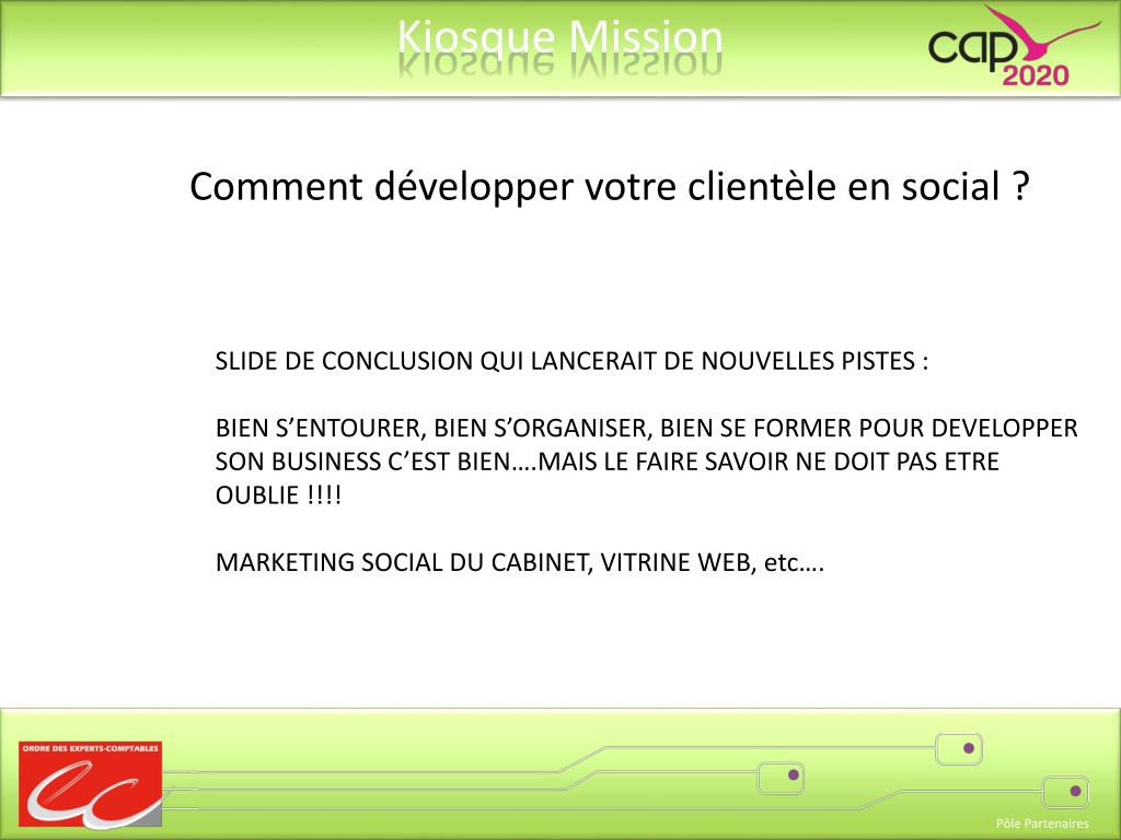 Comment développer votre clientèle en social ? SLIDE DE CONCLUSION QUI LANCERAIT DE NOUVELLES PISTES : BIEN S’ENTOURER, BIEN S’ORGANISER, BIEN SE FORMER POUR DEVELOPPER SON BUSINESS C’EST BIEN….MAIS LE FAIRE SAVOIR NE DOIT PAS ETRE OUBLIE !!!! MARKETING SOCIAL DU CABINET, VITRINE WEB, etc….