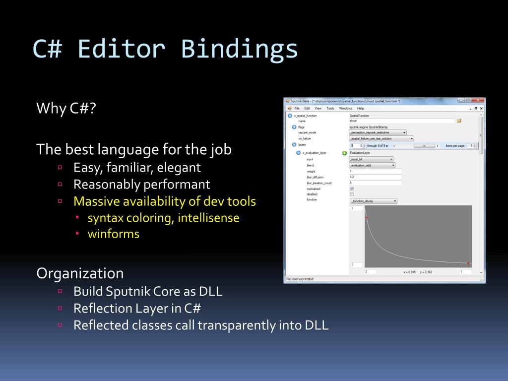 C# Editor Bindings Why C#? The best language for the job • Easy, familiar, elegant • Reasonably performant • Massive availability of dev tools • syntax coloring, intellisense • winforms Organization • Build Sputnik Core as DLL • Reflection Layer in C# • Reflected classes call transparently into DLL