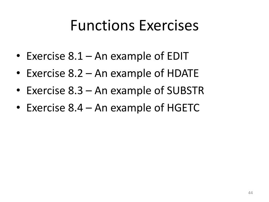 Functions Exercises • Exercise 8.1 – An example of EDIT • Exercise 8.2 – An example of HDATE • Exercise 8.3 – An example of SUBSTR • Exercise 8.4 – An example of HGETC