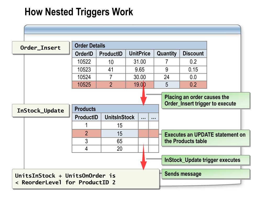 How Nested Triggers Work Order_Insert Placing an order causes the Order_Insert trigger to execute InStock_Update Executes an UPDATE statement on the Products table InStock_Update trigger executes UnitsInStock + UnitsOnOrder is < ReorderLevel for ProductID 2 Sends message