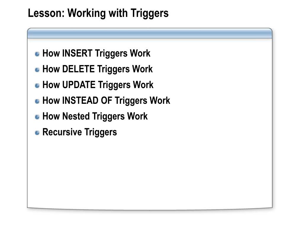 Lesson: Working with Triggers • How INSERT Triggers Work • How DELETE Triggers Work • How UPDATE Triggers Work • How INSTEAD OF Triggers Work • How Nested Triggers Work • Recursive Triggers