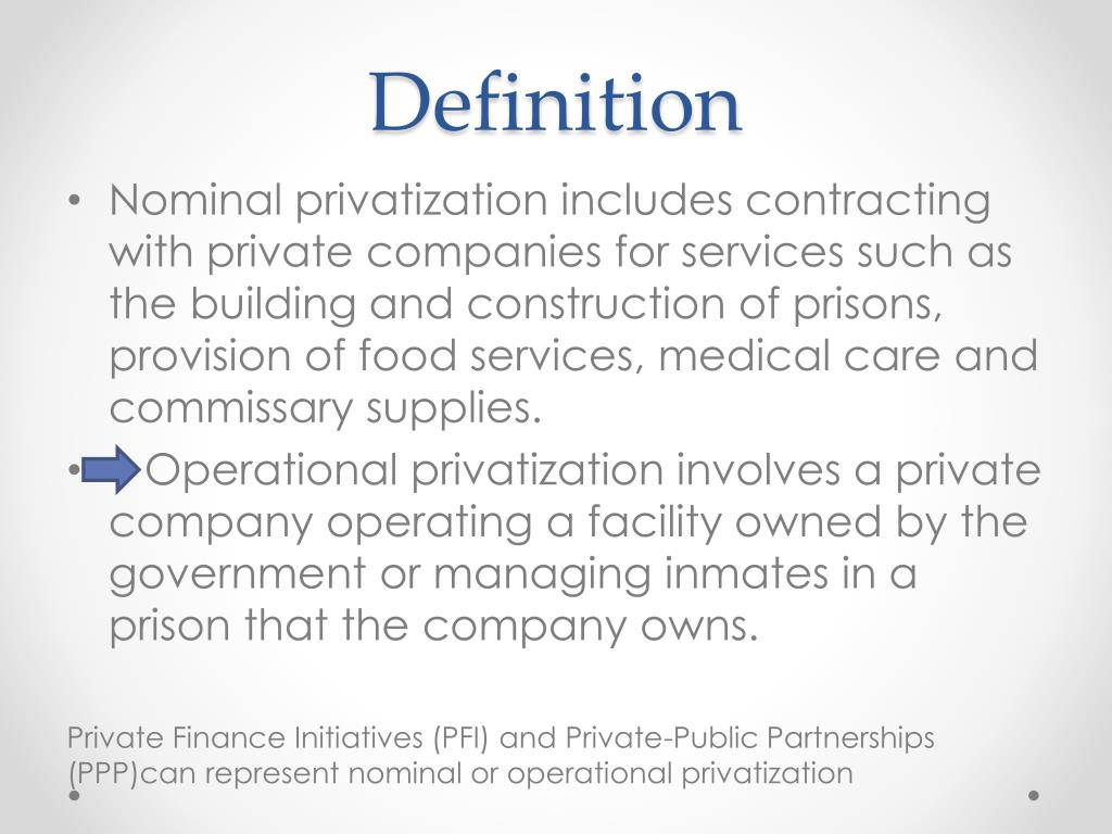 Definition • Nominal privatization includes contracting with private companies for services such as the building and construction of prisons, provision of food services, medical care and commissary supplies. • Operational privatization involves a private company operating a facility owned by the government or managing inmates in a prison that the company owns. Private Finance Initiatives (PFI) and Private-Public Partnerships (PPP)can represent nominal or operational privatization