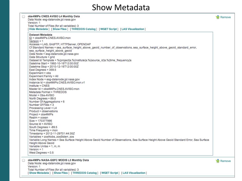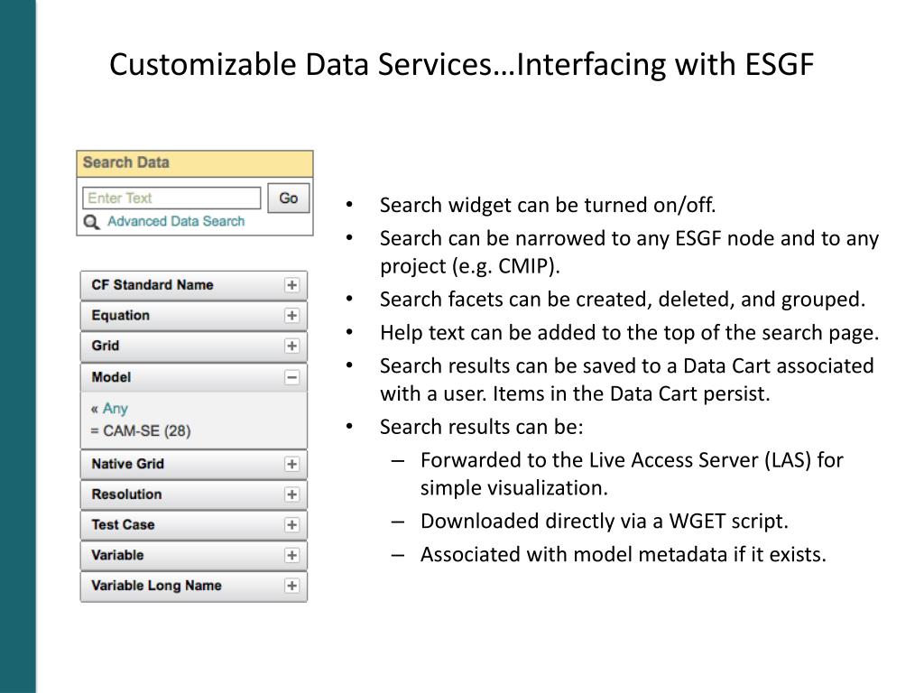 Customizable Data Services…Interfacing with ESGF • Search widget can be turned on/off. • Search can be narrowed to any ESGF node and to any project (e.g. CMIP). • Search facets can be created, deleted, and grouped. • Help text can be added to the top of the search page. • Search results can be saved to a Data Cart associated with a user. Items in the Data Cart persist. • Search results can be: • Forwarded to the Live Access Server (LAS) for simple visualization. • Downloaded directly via a WGET script. • Associated with model metadata if it exists.