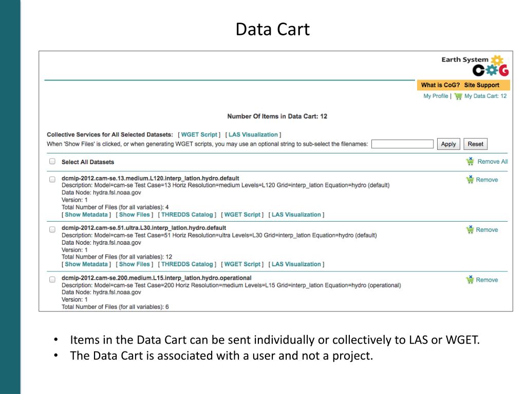 Data Cart • Items in the Data Cart can be sent individually or collectively to LAS or WGET. • The Data Cart is associated with a user and not a project.