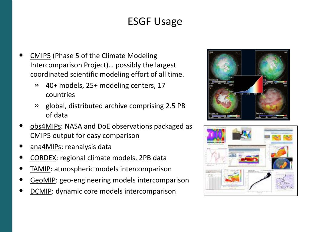 ESGF Usage • CMIP5 (Phase 5 of the Climate Modeling Intercomparison Project)… possibly the largest coordinated scientific modeling effort of all time. • 40+ models, 25+ modeling centers, 17 countries • global, distributed archive comprising 2.5 PB of data • obs4MIPs: NASA and DoE observations packaged as CMIP5 output for easy comparison • ana4MIPs: reanalysis data • CORDEX: regional climate models, 2PB data • TAMIP: atmospheric models intercomparison • GeoMIP: geo-engineering models intercomparison • DCMIP: dynamic core models intercomparison