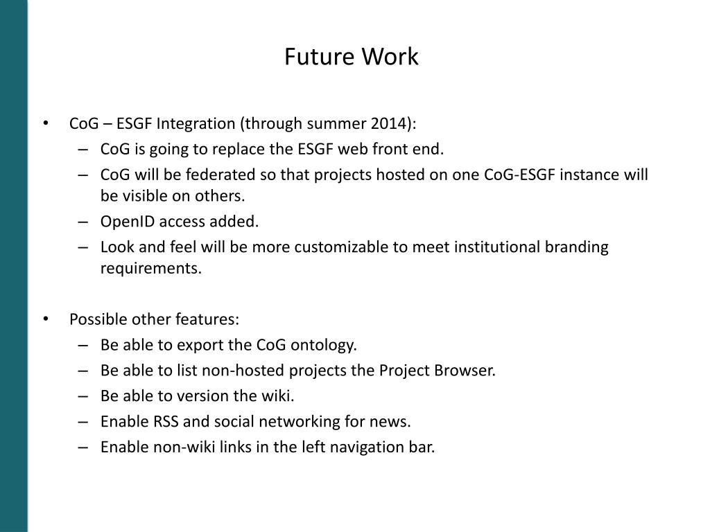 Future Work • CoG – ESGF Integration (through summer 2014): • CoG is going to replace the ESGF web front end. • CoG will be federated so that projects hosted on one CoG-ESGF instance will be visible on others. • OpenID access added. • Look and feel will be more customizable to meet institutional branding requirements. • Possible other features: • Be able to export the CoG ontology. • Be able to list non-hosted projects the Project Browser. • Be able to version the wiki. • Enable RSS and social networking for news. • Enable non-wiki links in the left navigation bar.