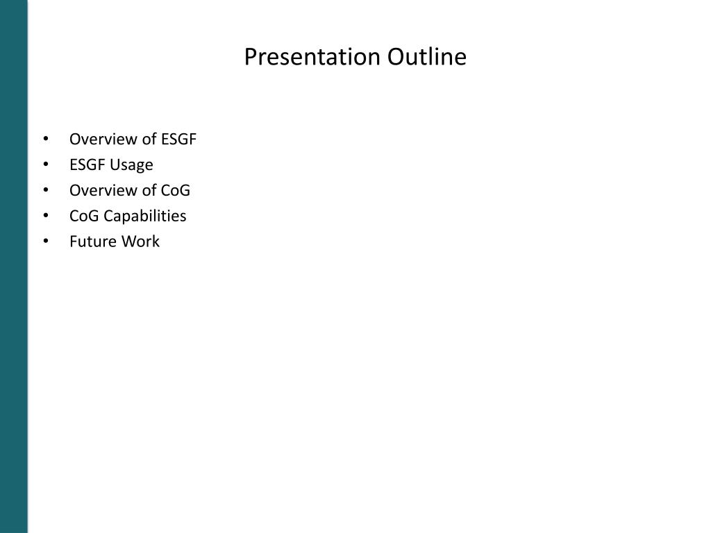 Presentation Outline • Overview of ESGF • ESGF Usage • Overview of CoG • CoG Capabilities • Future Work