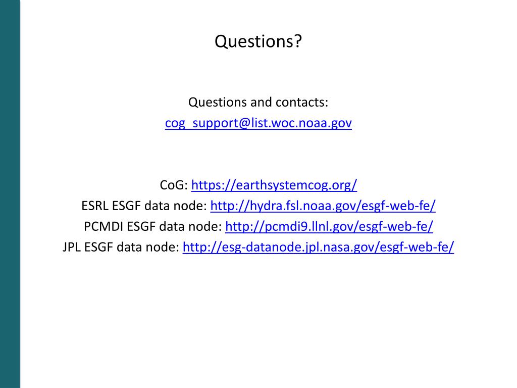 Questions? Questions and contacts: cog_support@list.woc.noaa.gov CoG: https://earthsystemcog.org/ ESRL ESGF data node: http://hydra.fsl.noaa.gov/esgf-web-fe/ PCMDI ESGF data node: http://pcmdi9.llnl.gov/esgf-web-fe/ JPL ESGF data node: http://esg-datanode.jpl.nasa.gov/esgf-web-fe/