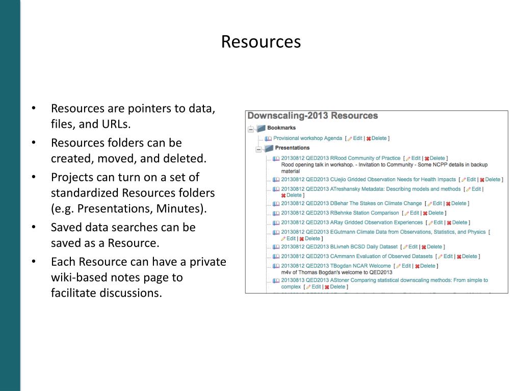 Resources • Resources are pointers to data, files, and URLs. • Resources folders can be created, moved, and deleted. • Projects can turn on a set of standardized Resources folders (e.g. Presentations, Minutes). • Saved data searches can be saved as a Resource. • Each Resource can have a private wiki-based notes page to facilitate discussions.