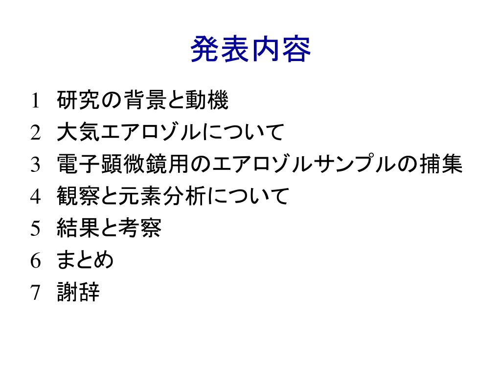 発表内容 1 研究の背景と動機 2 大気エアロゾルについて 3 電子顕微鏡用のエアロゾルサンプルの捕集 4 観察と元素分析について 5 結果と考察 6 まとめ 7 謝辞