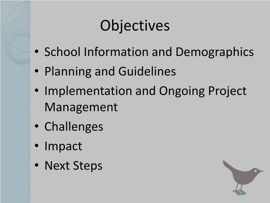 Objectives • School Information and Demographics • Planning and Guidelines • Implementation and Ongoing Project Management • Challenges • Impact • Next Steps