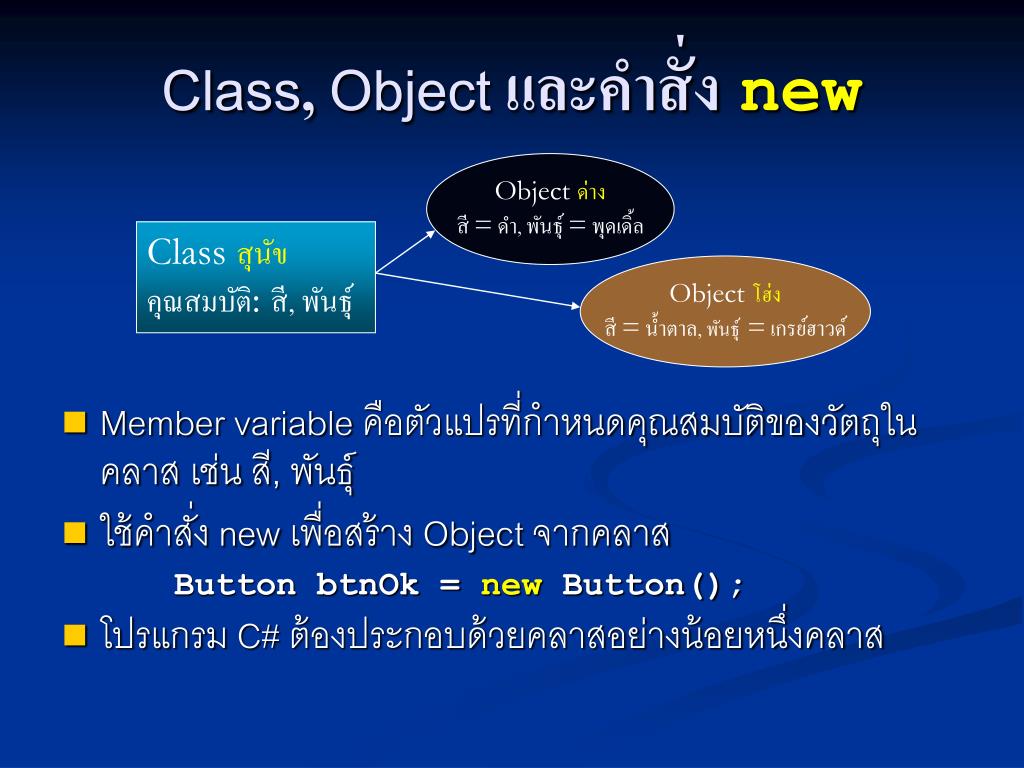 Class, Object และคำสั่งnew • Member variable คือตัวแปรที่กำหนดคุณสมบัติของวัตถุในคลาส เช่น สี, พันธุ์ • ใช้คำสั่ง new เพื่อสร้าง Object จากคลาส Button btnOk = new Button(); • โปรแกรม C# ต้องประกอบด้วยคลาสอย่างน้อยหนึ่งคลาส Object ด่าง สี = ดำ, พันธุ์ = พุดเดิ้ล Class สุนัข คุณสมบัติ: สี, พันธุ์ Object โฮ่ง สี = น้ำตาล, พันธุ์= เกรย์ฮาวด์