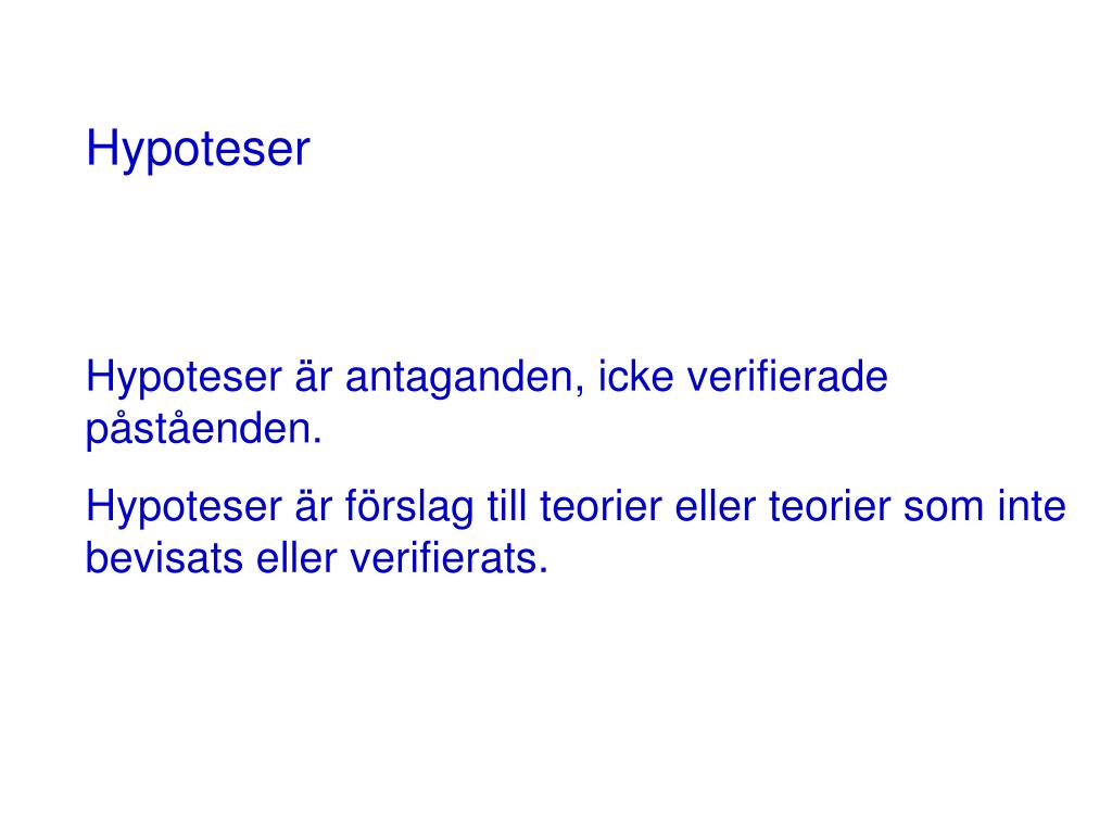 Hypoteser Hypoteser är antaganden, icke verifierade påståenden. Hypoteser är förslag till teorier eller teorier som inte bevisats eller verifierats.