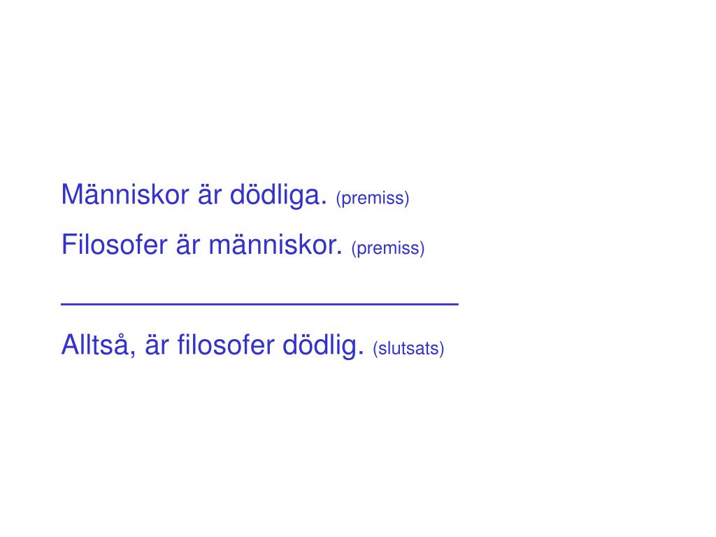 Människor är dödliga. (premiss) Filosofer är människor. (premiss) Alltså, är filosofer dödlig. (slutsats)