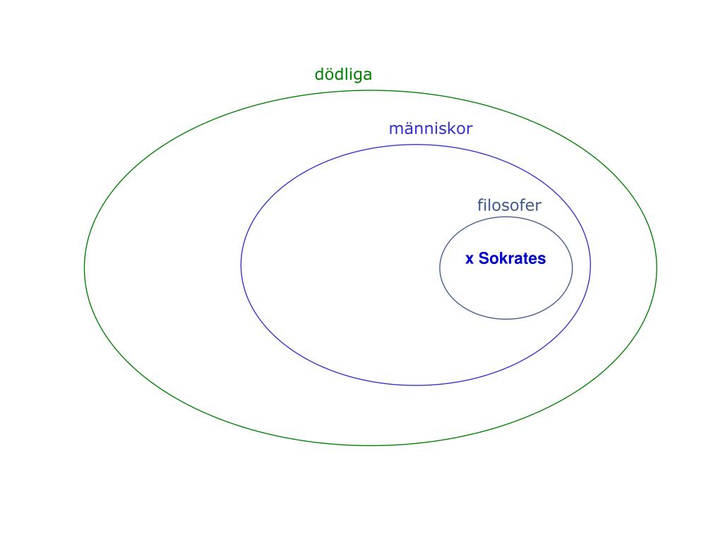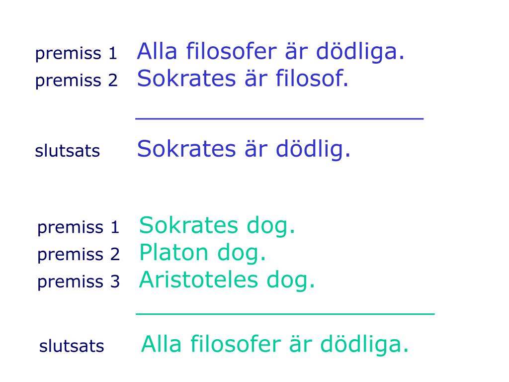 premiss 1 Alla filosofer är dödliga. premiss 2Sokrates är filosof. slutsats Sokrates är dödlig. premiss 1Sokrates dog. premiss 2Platon dog. premiss 3Aristoteles dog. slutsatsAlla filosofer är dödliga.