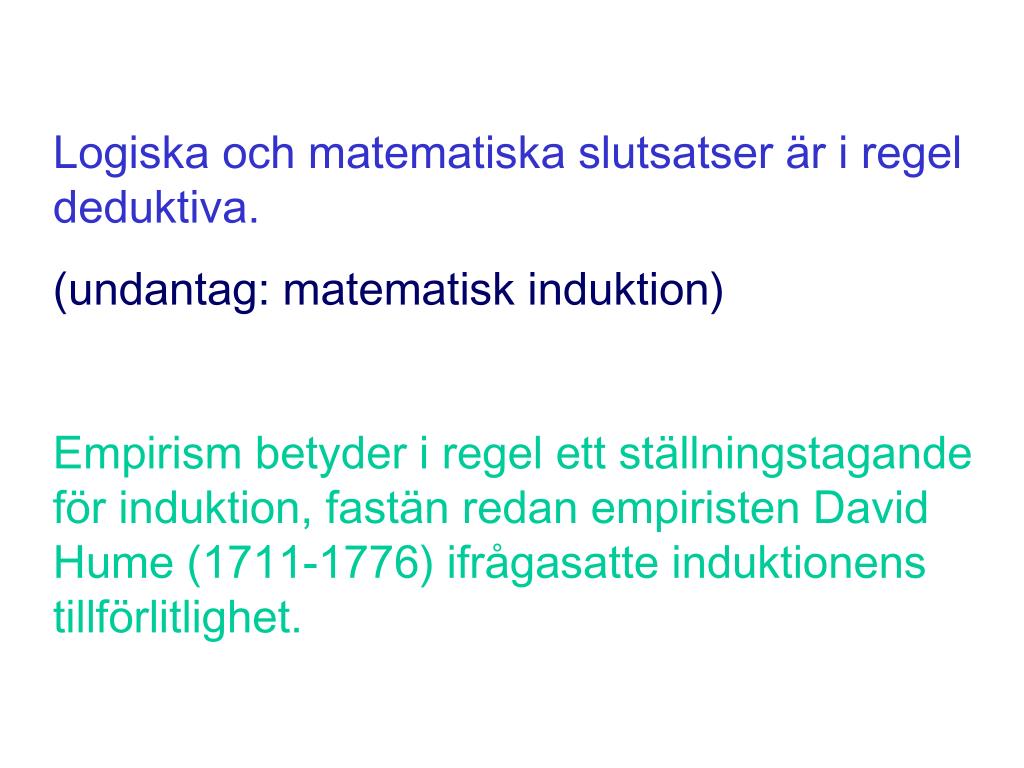Logiska och matematiska slutsatser är i regel deduktiva. (undantag: matematisk induktion) Empirism betyder i regel ett ställningstagande för induktion, fastän redan empiristen David Hume (1711-1776) ifrågasatte induktionens tillförlitlighet.