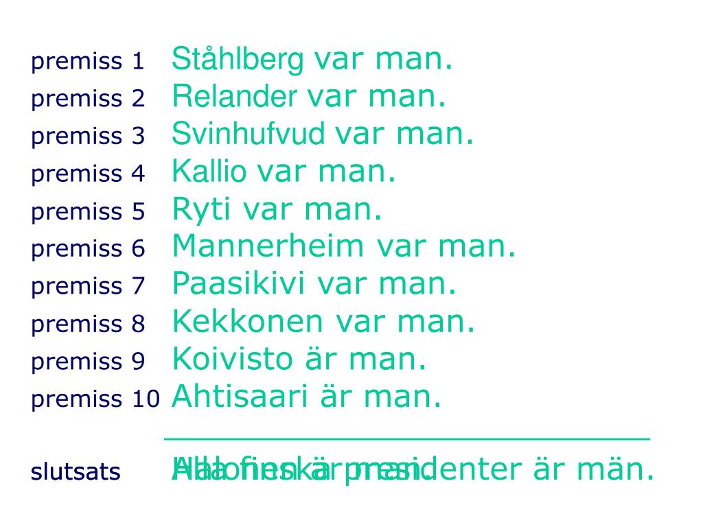 premiss 1 Ståhlberg var man. premiss 2 Relander var man. premiss 3 Svinhufvud var man. premiss 4 Kallio var man. premiss 5 Ryti var man. premiss 6Mannerheim var man. premiss 7Paasikivi var man. premiss 8Kekkonen var man. premiss 9Koivisto är man. premiss 10Ahtisaari är man. slutsatsAlla finska presidenter är män. slutsatsHalonen är man.