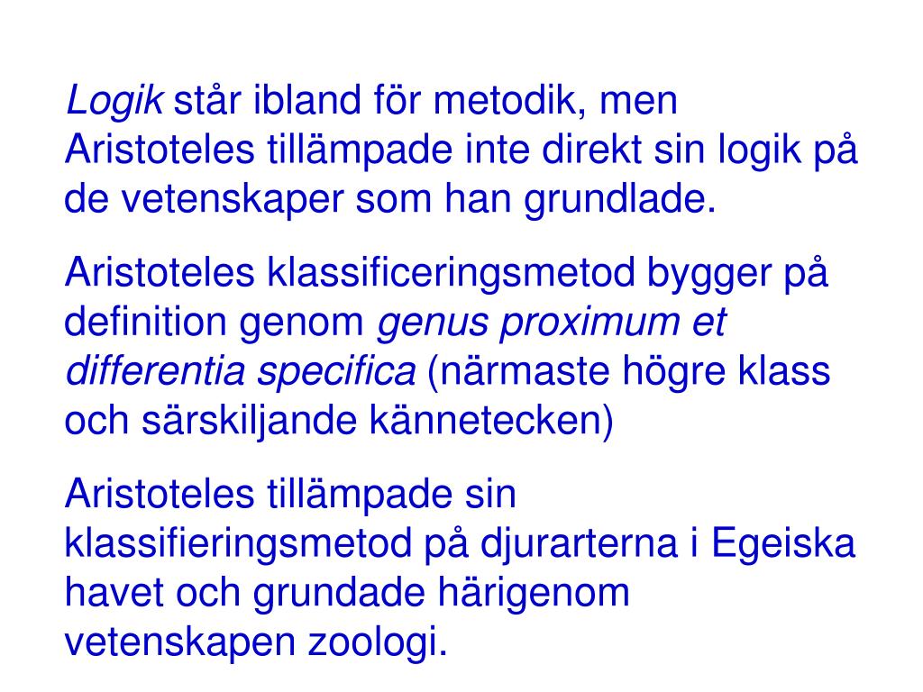 Logik står ibland för metodik, men Aristoteles tillämpade inte direkt sin logik på de vetenskaper som han grundlade. Aristoteles klassificeringsmetod bygger på definition genom genus proximum et differentia specifica (närmaste högre klass och särskiljande kännetecken) Aristoteles tillämpade sin klassifieringsmetod på djurarterna i Egeiska havet och grundade härigenom vetenskapen zoologi.