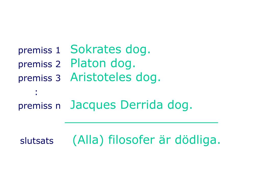 premiss 1Sokrates dog. premiss 2Platon dog. premiss 3Aristoteles dog. : premiss nJacques Derrida dog. slutsats(Alla) filosofer är dödliga.
