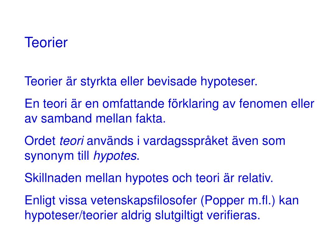 Teorier Teorier är styrkta eller bevisade hypoteser. En teori är en omfattande förklaring av fenomen eller av samband mellan fakta. Ordet teori används i vardagsspråket även som synonym till hypotes. Skillnaden mellan hypotes och teori är relativ. Enligt vissa vetenskapsfilosofer (Popper m.fl.) kan hypoteser/teorier aldrig slutgiltigt verifieras.