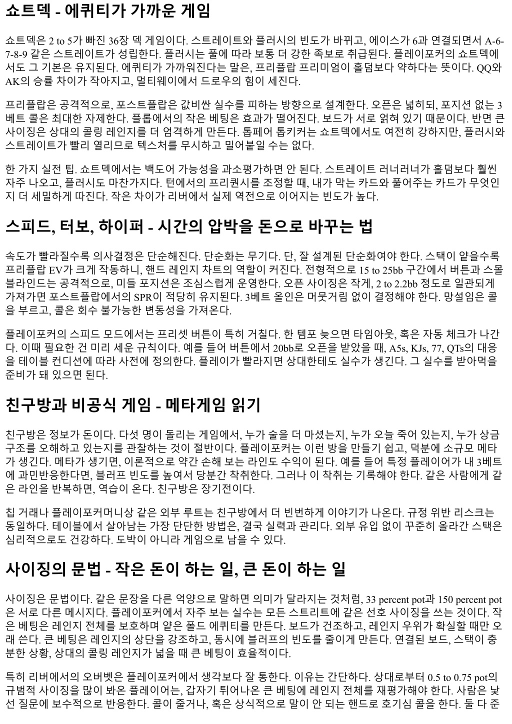 쇼트덱 - 에퀴티가가까운게임 쇼트덱은 2 to 5가빠진 36장덱게임이다. 스트레이트와플러시의빈도가바뀌고, 에이스가 6과연결되면서 A-6- 7-8-9 같은스트레이트가성립한다. 플러시는풀에따라보통더강한족보로취급된다. 플레이포커의쇼트덱에 서도그기본은유지된다. 에퀴티가가까워진다는말은, 프리플랍프리미엄이홀덤보다약하다는뜻이다. QQ와 AK의승률차이가작아지고, 멀티웨이에서드로우의힘이세진다. 프리플랍은공격적으로, 포스트플랍은값비싼실수를피하는방향으로설계한다. 오픈은넓히되, 포지션없는 3 베트콜은최대한자제한다. 플롭에서의작은베팅은효과가떨어진다. 보드가서로얽혀있기때문이다. 반면큰 사이징은상대의콜링레인지를더엄격하게만든다. 톱페어톱키커는쇼트덱에서도여전히강하지만, 플러시와 스트레이트가빨리열리므로텍스처를무시하고밀어붙일수는없다. 한가지실전팁. 쇼트덱에서는백도어가능성을과소평가하면안된다. 스트레이트러너러너가홀덤보다훨씬 자주나오고, 플러시도마찬가지다. 턴에서의프리퀀시를조정할때, 내가막는카드와풀어주는카드가무엇인 지더세밀하게따진다. 작은차이가리버에서실제역전으로이어지는빈도가높다. 스피드, 터보, 하이퍼 - 시간의압박을돈으로바꾸는법 속도가빨라질수록의사결정은단순해진다. 단순화는무기다. 단, 잘설계된단순화여야한다. 스택이얕을수록 프리플랍 EV가크게작동하니, 핸드레인지차트의역할이커진다. 전형적으로 15 to 25bb 구간에서버튼과스몰 블라인드는공격적으로, 미들포지션은조심스럽게운영한다. 오픈사이징은작게, 2 to 2.2bb 정도로일관되게 가져가면포스트플랍에서의 SPR이적당히유지된다. 3베트올인은머뭇거림없이결정해야한다. 망설임은콜 을부르고, 콜은회수불가능한변동성을가져온다. 플레이포커의스피드모드에서는프리셋버튼이특히거칠다. 한템포늦으면타임아웃, 혹은자동체크가나간 다. 이때필요한건미리세운규칙이다. 예를들어버튼에서 20bb로오픈을받았을때, A5s, KJs, 77, QTs의대응 을테이블컨디션에따라사전에정의한다. 플레이가빨라지면상대한테도실수가생긴다. 그실수를받아먹을 준비가돼있으면된다. 친구방과비공식게임 - 메타게임읽기 친구방은정보가돈이다. 다섯명이돌리는게임에서, 누가술을더마셨는지, 누가오늘죽어있는지, 누가상금 구조를오해하고있는지를관찰하는것이절반이다. 플레이포커는이런방을만들기쉽고, 덕분에소규모메타 가생긴다. 메타가생기면, 이론적으로약간손해보는라인도수익이된다. 예를들어특정플레이어가내 3베트 에과민반응한다면, 블러프빈도를높여서당분간착취한다. 그러나이착취는기록해야한다. 같은사람에게같 은라인을반복하면, 역습이온다. 친구방은장기전이다. 칩거래나플레이포커머니상같은외부루트는친구방에서더빈번하게이야기가나온다. 규정위반리스크는 동일하다. 테이블에서살아남는가장단단한방법은, 결국실력과관리다. 외부유입없이꾸준히올라간스택은 심리적으로도건강하다. 도박이아니라게임으로남을수있다. 사이징의문법 - 작은돈이하는일, 큰돈이하는일 사이징은문법이다. 같은문장을다른억양으로말하면의미가달라지는것처럼, 33 percent pot과 150 percent pot 은서로다른메시지다. 플레이포커에서자주보는실수는모든스트리트에같은선호사이징을쓰는것이다. 작 은베팅은레인지전체를보호하며얕은폴드에퀴티를만든다. 보드가건조하고, 레인지우위가확실할때만오 래쓴다. 큰베팅은레인지의상단을강조하고, 동시에블러프의빈도를줄이게만든다. 연결된보드, 스택이충 분한상황, 상대의콜링레인지가넓을때큰베팅이효율적이다. 특히리버에서의오버벳은플레이포커에서생각보다잘통한다. 이유는간단하다. 상대로부터 0.5 to 0.75 pot의 규범적사이징을많이봐온플레이어는, 갑자기튀어나온큰베팅에레인지전체를재평가해야한다. 사람은낯 선질문에보수적으로반응한다. 콜이줄거나, 혹은상식적으로말이안되는핸드로호기심콜을한다. 둘다준