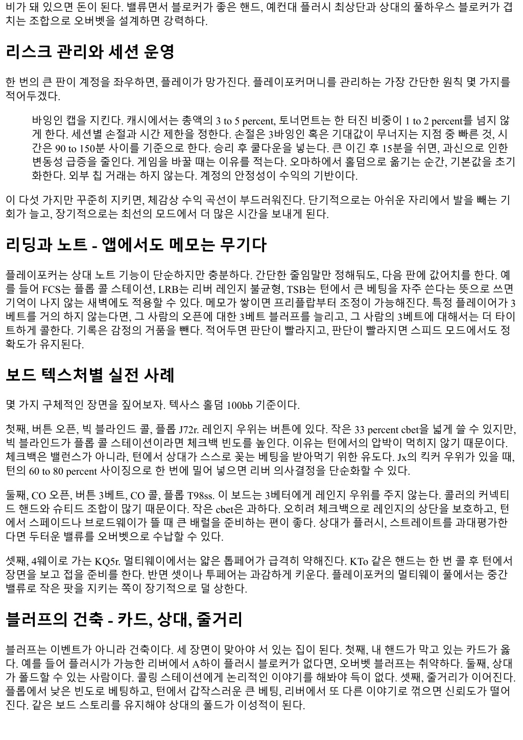 플레이포커에서는두번째조건이가장자주깨진다. 폴드치지않는상대는많이존재한다. 따라서블러프빈도 는전체적으로줄이고, 성공률이눈에보이는자리에서만집행한다. 특히헤즈업보다는멀티웨이에서블러프는 거의사양한다. 상대가늘어나면, 폴드가줄어드는것은확률의필연이다. 학습루프와딥다이브 앱에서의경험을테이블밖의학습으로연결하면성장속도가늘어난다. 손의기록을세가지범주로모은다. 큰 승리, 큰패배, 아쉬운콜. 큰승리는잘한것이아니다. 과도하게리스크를떠안고운이도왔을수있다. 큰패배 는무조건실수가아니다. 상대가더강했을뿐일수도있다. 아쉬운콜은습관의거울이다. 이세가지를한주단 위로 20핸드정도추려서다시본다. 플랍비스와턴, 리버의사이징과레인지가이론과얼마나어긋났는지체크 한다. 이과정을두달만유지해도, 허튼배럴이줄고밸류가두꺼워진다. 카드밖의요소 - 집중, 속도, 멘탈 플레이포커는장소의제약이없다. 장점이자함정이다. 이동중에, 대기중에, TV를보면서베팅하면정보가새 어나간다. 두눈을온전히테이블에가져다놓을수있는시간에만켠다. 깊은세션전에가벼운준비루틴을만 든다. 두줄짜리레인지리마인드, 오늘의리스트목표한항목, 한판접어야할신호두가지. 멘탈은습관이다. 습관이있으면흔들릴때돌아갈곳이생긴다. 모드선택의우선순위 결국어디에시간을더써야하느냐의문제로돌아온다. 자신이강한포맷에투자하는것이답이다. 실전경험상, 대부분의플레이어는한두포맷에서만뚜렷한엣지를갖는다. 텍사스홀덤캐시에서승률이검증된사람은토너 먼트에서수익을내기까지시간이더걸리기도한다. 반대로토너먼트의압박과 ICM에익숙한사람은캐시의깊 은스팟에서망설인다. 하루 90분이있다면, 60분은주종목, 30분은보조종목에투자한다. 보조종목은피로하지 않을때만연다. 피곤한상태에서새로운포맷을테스트하면, 학습이아니라손실만남는다. 마무리관점 - 무엇을언제밀어넣을것인가 플레이포커의각모드는룰보다환경이성적을가른다. 콜이많은풀, 프리셋사이징, 빠른템포, 큰참가자수, 이 모든것이전략의버튼을조금씩조정하게만든다. 공통의축은명확하다. 포지션을존중하고, 사이징을설계하 고, 상대의콜성향을현장에서측정한다. 밸류는두껍게, 블러프는정교하게, 머니관리는무조건적이다. 플레이 포커머니를바르게키우면, 더좋은자리에더오래앉아있게된다. 그시간이기술을익히게하고, 기술이다시 시간을벌어준다. 게임은그반복에서이익을낳는다. 마지막으로, 무엇을언제밀어넣을지에대한기준을몸에심어두자. 캐시는스택이충분할때고점밸류로, 토너 먼트는 ICM이적을때넓게, 버블과파이널에서는좁고비싸게. 오마하는넛과재드로우가겹칠때만크게, 쇼트 덱은에퀴티가붙을때주저하지않고. 속도가올라갈수록프리플랍차트의품질이, 풀의콜이늘어날수록리버 사이징의용기가빛난다. 오늘도같은앱, 다른장면이펼쳐진다. 그장면에맞는대답을준비해두면, 숫자는자 연히오른다.