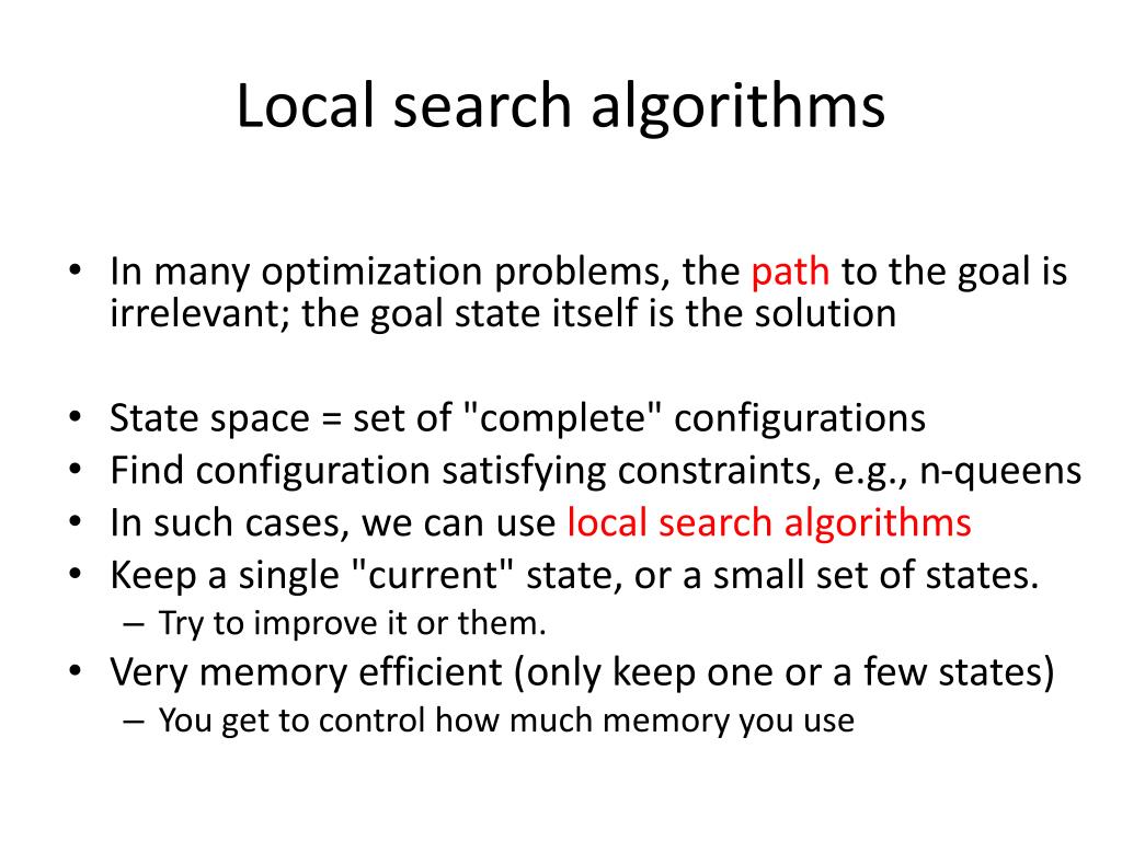 Local search algorithms • In many optimization problems, the path to the goal is irrelevant; the goal state itself is the solution • State space = set of "complete" configurations • Find configuration satisfying constraints, e.g., n-queens • In such cases, we can use local search algorithms • Keep a single "current" state, or a small set of states. • Try to improve it or them. • Very memory efficient (only keep one or a few states) • You get to control how much memory you use