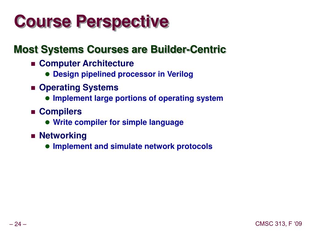 Course Perspective • Most Systems Courses are Builder-Centric • Computer Architecture • Design pipelined processor in Verilog • Operating Systems • Implement large portions of operating system • Compilers • Write compiler for simple language • Networking • Implement and simulate network protocols