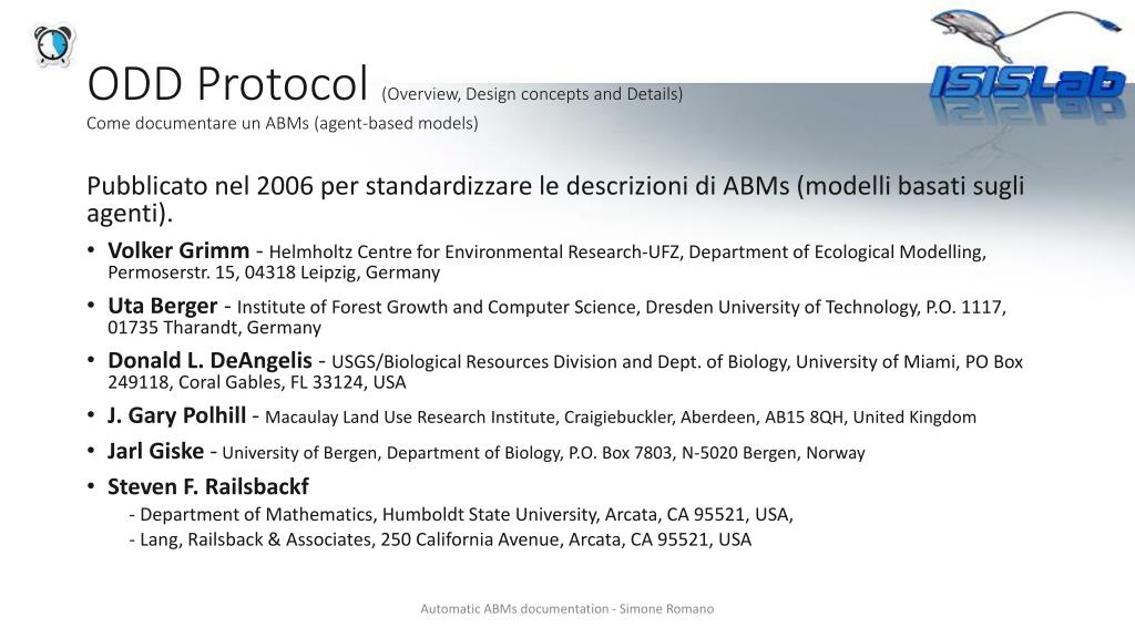ODD Protocol(Overview, Design concepts and Details)Come documentare un ABMs (agent-basedmodels) Pubblicato nel 2006 per standardizzare le descrizioni di ABMs (modelli basati sugli agenti). • Volker Grimm - Helmholtz Centre for EnvironmentalResearch-UFZ, Department of EcologicalModelling, Permoserstr. 15, 04318 Leipzig, Germany • Uta Berger - Institute of Forest Growth and Computer Science, Dresden University of Technology, P.O. 1117, 01735 Tharandt, Germany • Donald L. DeAngelis- USGS/Biological Resources Division and Dept. of Biology, University of Miami, PO Box 249118, Coral Gables, FL 33124, USA • J. Gary Polhill - Macaulay Land Use Research Institute, Craigiebuckler, Aberdeen, AB15 8QH, United Kingdom • JarlGiske-University of Bergen, Department of Biology, P.O. Box 7803, N-5020 Bergen, Norway • Steven F. Railsbackf - Department of Mathematics, Humboldt State University, Arcata, CA 95521, USA, - Lang, Railsback & Associates, 250 California Avenue, Arcata, CA 95521, USA Automatic ABMs documentation - Simone Romano