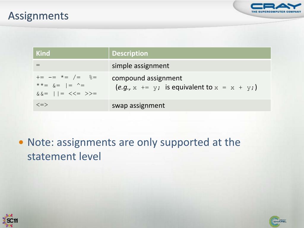 Variables, Constants, and Parameters • Basic syntax • Semantics • var/const: execution-time variable/constant • param: compile-time constant • No init-expr initial value is the type’s default • No type type is taken from init-expr • Examples declaration: varidentifier [:type][= init-expr]; constidentifier [:type][= init-expr]; paramidentifier [:type][= init-expr]; const pi: real = 3.14159; var count: int; // initialized to 0 param debug = true; // inferred to be bool