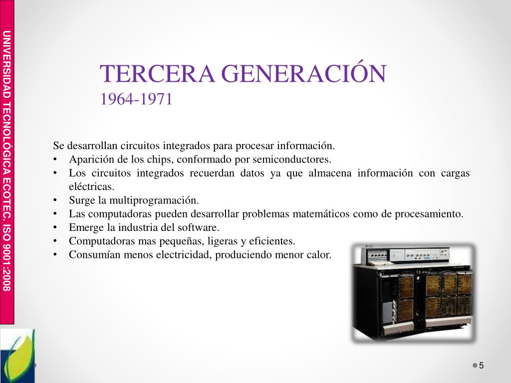 TERCERA GENERACIÓN 1964-1971 • Se desarrollan circuitos integrados para procesar información. • Aparición de los chips, conformado por semiconductores. • Los circuitos integrados recuerdan datos ya que almacena información con cargas eléctricas. • Surge la multiprogramación. • Las computadoras pueden desarrollar problemas matemáticos como de procesamiento. • Emerge la industria del software. • Computadoras mas pequeñas, ligeras y eficientes. • Consumían menos electricidad, produciendo menor calor.