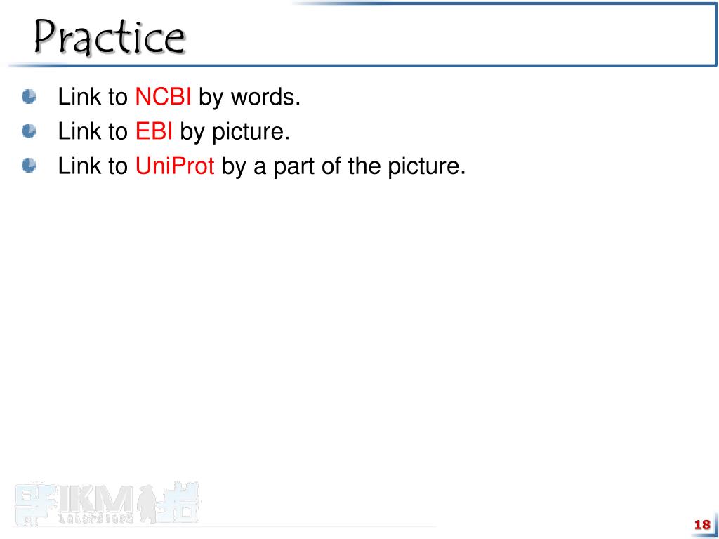 Practice • Link to NCBI by words. • Link to EBI by picture. • Link to UniProt by a part of the picture.