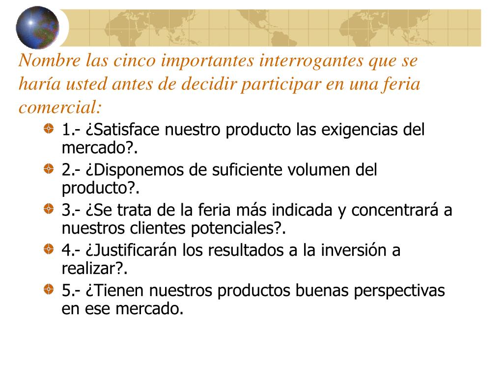 Nombre las cinco importantes interrogantes que se haría usted antes de decidir participar en una feria comercial: • 1.- ¿Satisface nuestro producto las exigencias del mercado?. • 2.- ¿Disponemos de suficiente volumen del producto?. • 3.- ¿Se trata de la feria más indicada y concentrará a nuestros clientes potenciales?. • 4.- ¿Justificarán los resultados a la inversión a realizar?. • 5.- ¿Tienen nuestros productos buenas perspectivas en ese mercado.