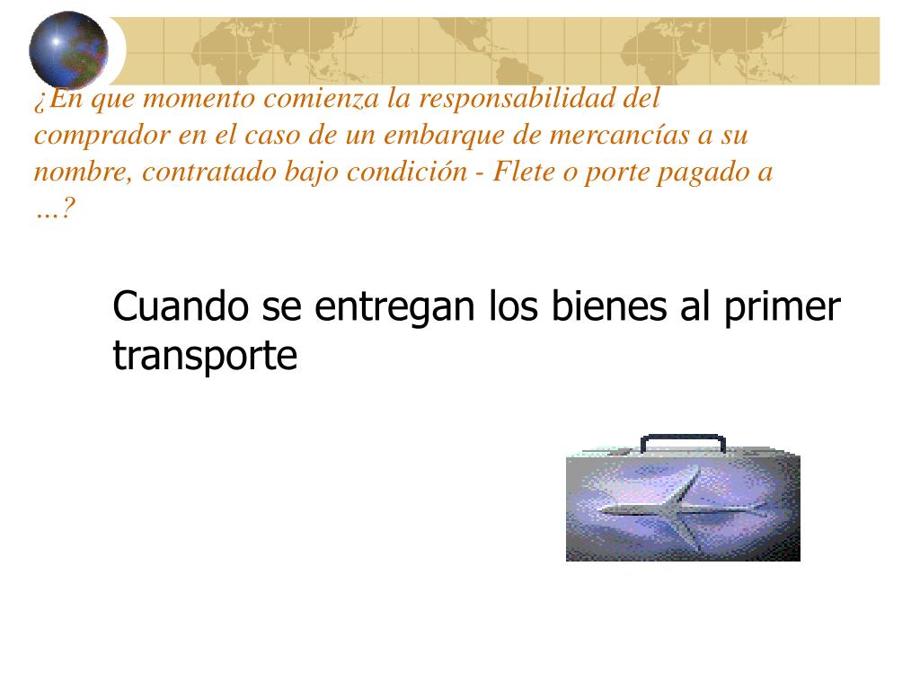 ¿En que momento comienza la responsabilidad del comprador en el caso de un embarque de mercancías a su nombre, contratado bajo condición - Flete o porte pagado a …? Cuando se entregan los bienes al primer transporte